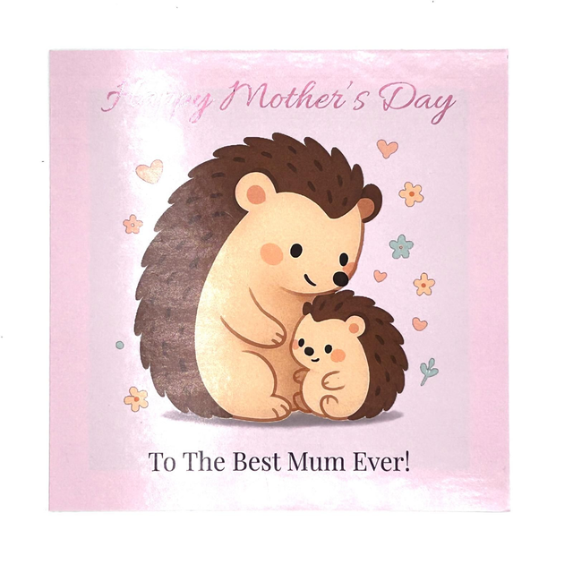 A heartwarming Mother’s Day card featuring a sweet mum and baby hedgehog surrounded by tiny flowers and hearts.